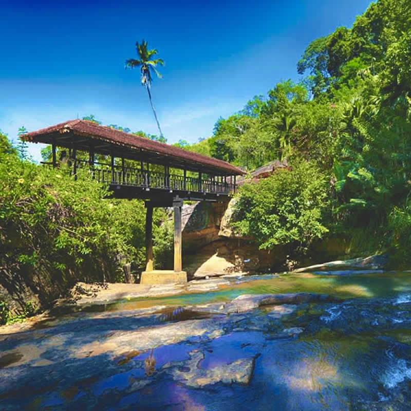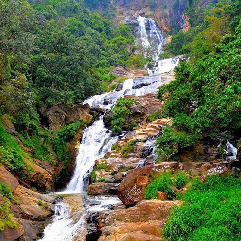 This waterfall measures approximately 25 m (82 ft) in height and cascades from an oval-shaped concave rock outcrop. During the local wet season, the waterfall turns into what is said to resemble an areca flower with withering petals. But this is not the case in the dry season, where the flow of water reduces dramatically. The falls form part of the Ravana Ella Wildlife Sanctuary